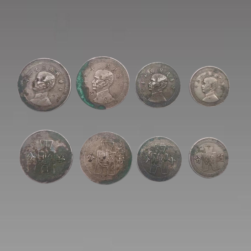 此“中华民国孙中山头像镍币(四枚)”镍币产于民国。正面是孙中山先生的侧面和民国纪年。背面是布币和它的面值。模式设计字体典雅清秀,正面图案采用的是侧面的孙中山像,中国传统的古布图案,背面是雕刻背面的边线,形成线条(传统的中国古代图案被认为是幸运的),币面光滑紧密,精良的工艺,整齐而恒定的版式,在所有的镍币中,其文字、纹饰,甚至连头像的眉毛、眼睑、胡须等细节,得分都刻画细腻和非常明了。包浆自然老旧,有流通痕迹。随着收藏投资热的不断升温,孙中山像货币在钱币市场中异常火爆,今后极大可能成为收藏投资领域中的一匹“黑马”,其价格一路上扬。加之,旧时钱币是不可再生之物,且存世量极为稀少,蕴含着深刻的历史价值、文化价值、收藏价值,深受收藏者的喜爱。近几年钱币价格不断飙升,除了钱币收藏家的扩大,实力买家的介入也是关键原因。普遍收藏者要放远眼光择机进场,市场表现一直波澜不惊的钱币忽然扶摇直上,以孙中山像为代表的老钱币价值不断高涨。随着收藏投资热的不断升温,孙中山像钱币日渐走俏,异常火爆,在藏品交易市场上表现异常活跃,市场前景非常看好。