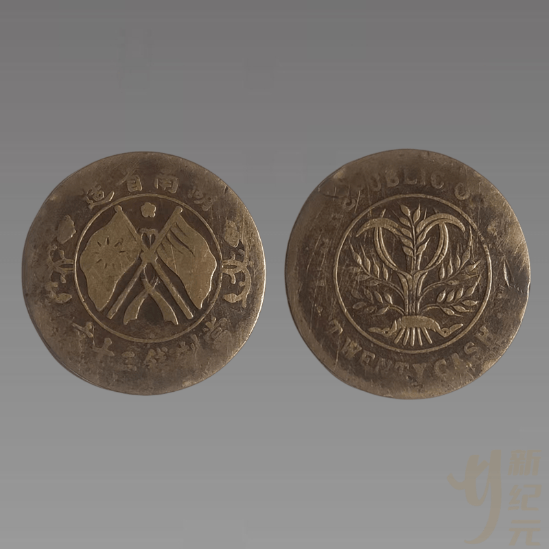 铜钱正面图案中央是两面相交的旗帜,上面写着“湖南省造”四个字,下面写着“当制钱二十文”。背面图案为稻穗组成的嘉禾纹,周围用英文标注“TWENTYCASH”。这枚铜币现存的数量并不多,上面的包浆锈蚀证明了它的历史沉淀,不难看出它的历史过渡性,虽然经历了很多次的风吹雨打,但是上面的纹路依然清晰可见。它是中国近代钱币中的精品,具有历史熏陶,是具有历史意义的珍贵革命文物;同时也是难得的考古与研究中国历史文化的实物。数量极少,尤其是品相好的,更是凤毛麟角,所以受到了收藏家的青睐。