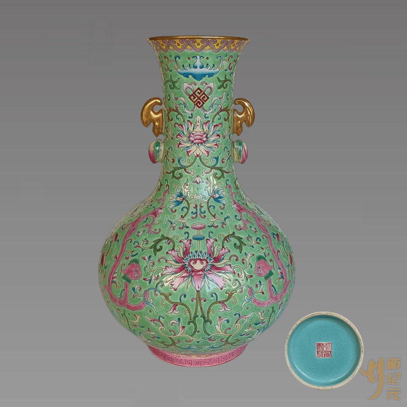此“大清乾隆年制”松石绿釉龙穿花卉缠枝莲纹赏瓶,高度约:28.5cm,撇口,长颈,球形腹,圈足颈部轮廓秀美,腹部浑圆,圈足外撇底书"大清乾隆年制"六字三行篆书款。器形规矩,胎体匀润。赏瓶的器型优美,适合于在器上绘制纹饰,赏瓶赐于功臣之后,此器将被放置于较为明显的地方,便于臣子观赏,感受皇恩。一般采用固定模式的纹饰,颈部装饰青花蕉叶纹,腹部装饰缠枝莲纹。其意喻深刻,包含着封建社会的意愿,希望时政“清廉”。也正因如此,有清一代宫廷御瓷的一些品种与器形始终前后相袭,每朝必备,每岁必制,旧档称“岁例供瓷”,绿釉龙穿花卉缠枝莲纹赏瓶便为其中一例。历经数百年而釉面依旧完好,极为难得。加之尊贵典雅,釉彩妍美多姿,彰显出无与伦比的艺术魅力,珍罕程度必为世人所推崇。