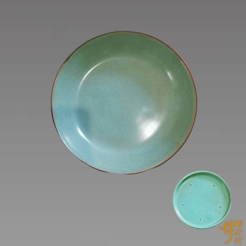 此“汝窑天青釉洗”口径约:17.5cm 底径约:11cm 高约:4cm,造型优美,古朴大方,通体施釉,釉层肥润,胎体结实,底有支钉烧造痕迹,保存完好,釉中掺有汝州当地的玛瑙石成分,釉面光泽莹润多变,如春水般柔和清澈,妙不可言,且开细片,纹线细小,底有细小的支钉痕,为裹足支烧,通过支丁痕可见胎色为香灰胎。由于汝窑烧造时间短,制品较少,南宋文献就有“近尤难得”的记载,目前宋汝窑传世品极少,可见其珍贵程度。汝窑笔洗 在中国古代,文人的案头除了一支毛笔以外,还有不少“伺候”笔的用具,用来盛水洗笔的“笔洗”就是其中之一。随着现今收藏市场对古代文房用具的重视,笔洗也渐渐成为收藏界的新宠,其在拍卖市场上的价值也是屡创新高。