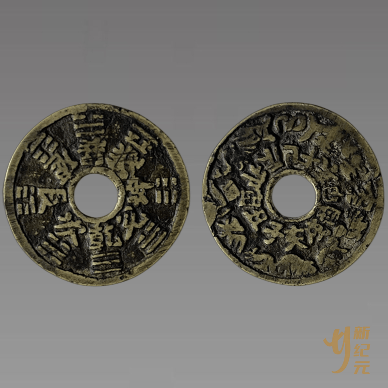 花钱,源于汉,兴于魏晋,鼎盛在明清。花钱是中国古钱币的分支,是中国民间自娱自乐的一种玩钱,这种钱币由于不是流通钱,因此它的材质大都比较粗糙,中国民间把这种钱俗称为“花钱”。“花钱”虽然具有钱币的形态,但不作流通使用,是钱币中的“非正用品”。中国民间花钱的种类繁多,诸如开炉、镇库、馈赠、祝福、玩赏、戏作、配饰、生肖等等都要铸钱,这种“钱”,其实是专供某种需要的辟邪品、吉利品、纪念品。其中“吉语钱”是比较普遍的一类花钱。主要以“长命富贵”、“福德长寿”、“加官进禄”、 “天下太平”等吉语为内容。到了清代铸行极盛,民间行用甚广,是清代道士用来施法以降妖震鬼驱邪的载体,也可叫法器。经道士开光后,百姓请回挂于家中镇宅或随身携带保平安。山鬼,即山神,因未获天帝正式册封到正神之列,所以也被称为山鬼。自古以来,山鬼都是以正义、高大的形象存在。在清代山鬼花钱是流传最广的时期,很多人都将其佩戴在帽子、腰带上,一来其美观的形象可以作为一种饰品,二来也可以满足驱鬼辟邪的心理。除此之外,山鬼花钱也多被用在屋角、影壁之类的地方,作为镇宅之物。而带有八卦图案的山鬼花钱,更是其中的上品山鬼花钱。下图便是新纪元有幸征集到的一枚十二生肖八卦花钱。