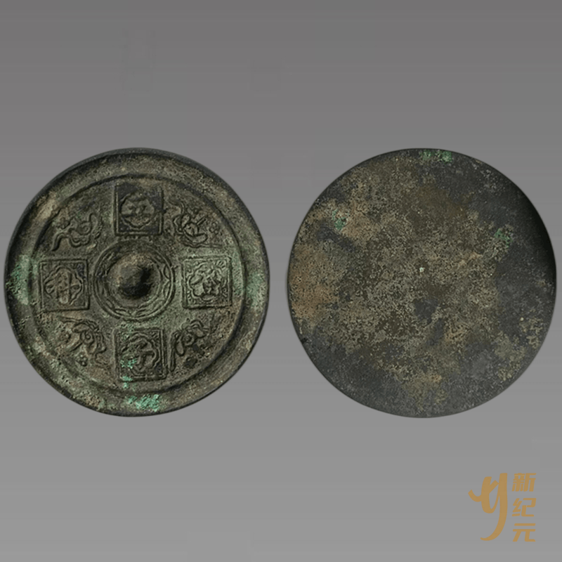 历经无穷岁月的洗礼,铜镜表面有轻微磨损,但不影响其整体美观,反而多了一分历史沧桑感,观之别有一番韵味。铜镜呈圆形,镜面近平,素面无纹饰,镜身较薄;镜背钮为乳突状,双轮镜缘,镜身是五子登科四字,四字方方正正排列于钮的四周,每个字均用方框框着。民间传说,“五子登科”又别称“五子高升”,指的是古时有一人,教育五个儿子均登科作了大官,由此得到“教子有方”的赞誉。后人便将此事化为口语,使之得以广泛流传。“五子登科”后来也成为中国传统吉祥图案,寄托了一般人家期望子弟都能像窦禹钧五子一样获得科考成功,寓意非常吉祥美好。