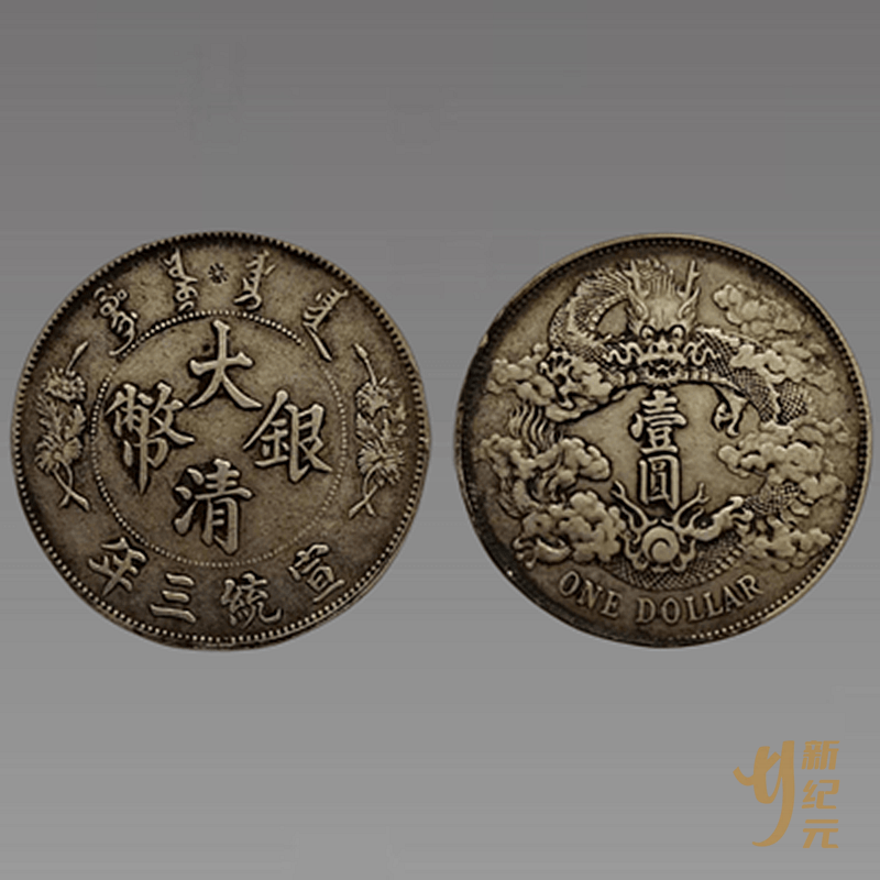 此大清银币宣统三年银币系清朝度支部天津造币总厂于宣统三年(1911年)铸造。银币正面中央珠圈内镌汉字“大清银币”,珠圈外上端镌满文“大清银币”,下端镌汉字“宣统三年”,左右两侧各镌一个对称的花饰。银币背面镌一个环状盘旋的曲须龙和大片云朵,内镌币值“壹圆”,下端镌币值壹圆的英文“ONE DOLLAR”。此币文字清秀俊美,大气磅礴,包浆自然,铸造精湛,铸模极深,内齿锋利,背面龙纹打造深峻清晰,正面五彩银光绚丽,龙图缎面光泽夺目,品相堪称完美,表面光滑、光泽度高,为清代中央铸币典范之作,非常珍贵,是一组不可多得的精美银币。