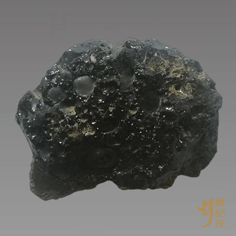 玻璃陨石通常为墨黑色、漆黑色,少数带有绿色,棕色,褐色,深褐色和朱砂色,呈玻璃光泽,贝壳状断口,全玻璃质,即使在电镜下放大数千倍也表现出非晶质性和断口特征。个体大小不一,重量不等。内部高纯度无杂质,通体布满致密的小气泡,外部有融壳,融壳上有流纹,外部和融壳下有时会产生大的气印。
