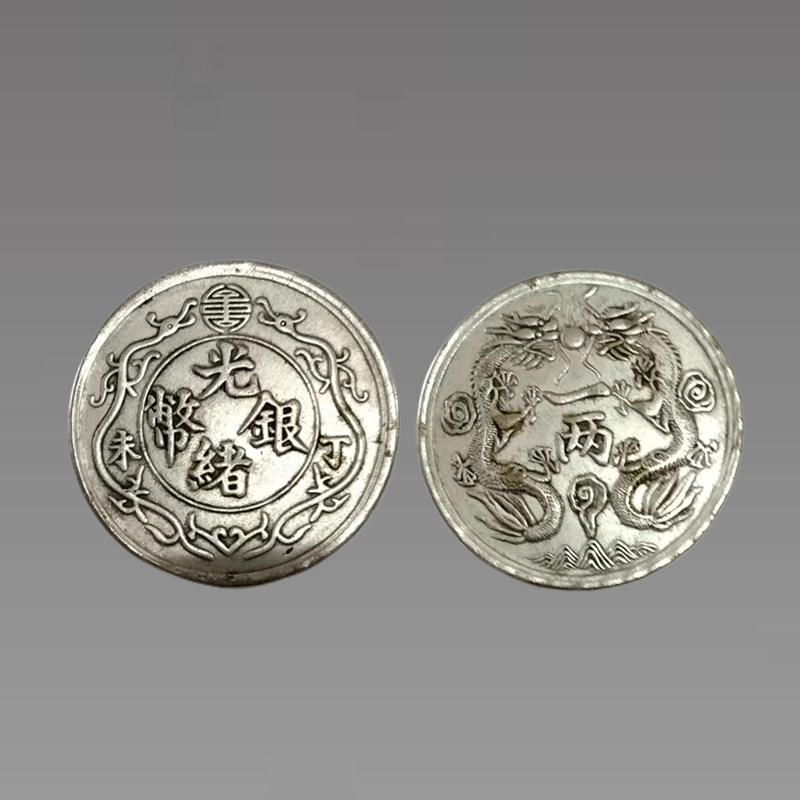 银币正面中央圆圈内镌“光绪银币”四个字,圈外左右两侧分镌“丁未”二字和一对双龙戏珠(寿字)图案。银币背面中央镌“一两”二字,两侧镌双龙戏珠图案,两条龙的背部和龙腹部分别镌有三团云朵,下端镌海浪图案。正面和背面的龙图造型完全不同。此款光绪元宝发行量极少,丁未一两,品相完整,保存完好,有一定包浆年代感。