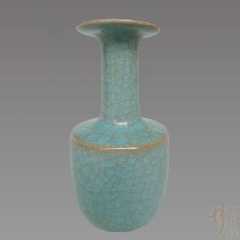 此“宋汝窑”纸缒瓶(藏品名称由藏友提供)中华传统制瓷著名工艺之一,在中国陶瓷史上素有“汝窑为魁”之称。纸槌瓶,因形似造纸打浆所用槌具而得名,为宋代瓷器的经典造型。本瓶浅盘口,长颈,溜肩,筒腹,支钉裹足。通体满施青釉,釉色莹润朴雅,如春水般柔和清澈,妙不可言,釉面满布细碎透明及浅色开片纹,颈肩聚釉处,呈色青绿。底有细小的支钉痕,为裹足支烧,通过支丁痕可见胎色为香灰胎。此瓶造型小巧而端庄,釉色匀净,一展宋代汝窑风采,工艺考究,以玛瑙入釉。色泽独特,随光变幻,妙不可言。其釉色,青如明镜,绝美脱俗,有只可意会,不可言传之妙,仿佛说出来就沾惹了尘世俗气。与传说中绝世的柴瓷,同享“雨过天晴云破处,这般颜色做将来”的盛誉。能流传至今,实属难能可贵,具有较高的收藏价值和文化艺术价值!