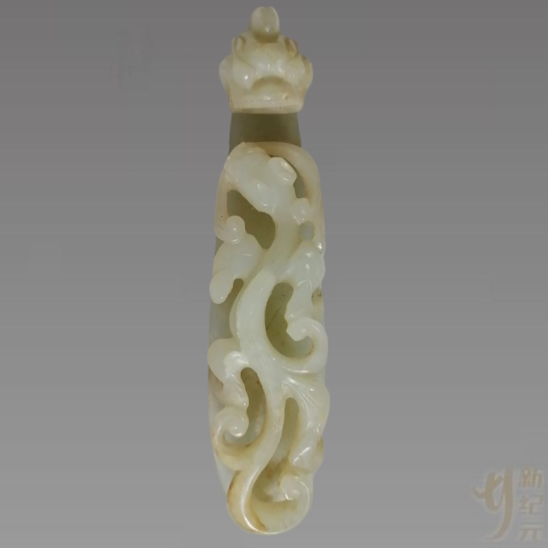 元代玉龙钩的特征龙首小而扁长,龙的双角表现不清。龙首的眉毛上扬,相向弯转呈勾云纹;眉额隆起,有重眉压眼之感;龙首的吻部用阴刻线条表现唇和上下的排牙;龙嘴侧横钻一对穿孔,以示空腔;龙无鬓而有发较粗,发有两撮、三撮之分,且有长有短,长者可披肩。龙钩的钩背上琢的皆系螭,有作伏地状的浮雕,也有螭身腾起其口含灵芝,方首单尾,但尾后部左右卷曲分离。螭身细呈弧形,曲线流畅,偎依贴附在大龙身上,用深雕技法。其龙首与螭之间的间距较大。元代龙钩的形较宽,似琵琶形,钩钮作成长方形环孔或琢成锤形钮,且贴近尾部。