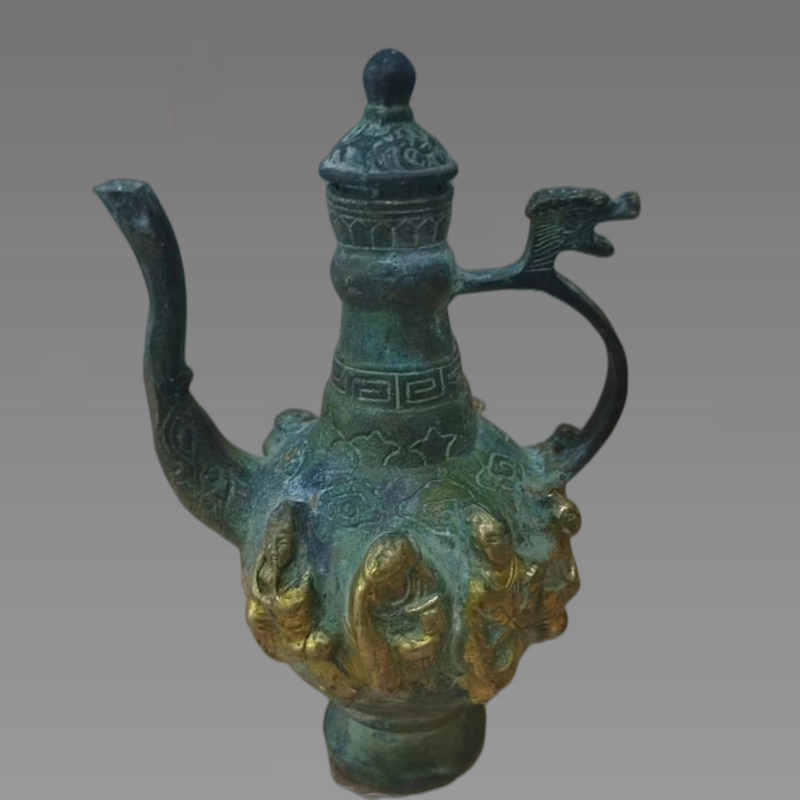 据资料记载此类风格的执壶是由明宣宗朱瞻基在大明宣德三年参与设计监造的御用酒壶,也是至今为止一款皇帝使用的酒壶。八仙过海人物造型经铸造艺人手工打磨而成,艺术流畅,线条整体稳重大方,壶口是皇冠阳花纹饰,龙头威武,壶嘴凤凰纹饰秀美,壶口略平于壶嘴。底部繁体字大明宣德,大字人造型,明字强劲有力,宣字点不过横盖竖直到底,德字繁体古文,此为上品,令人爱不释手。