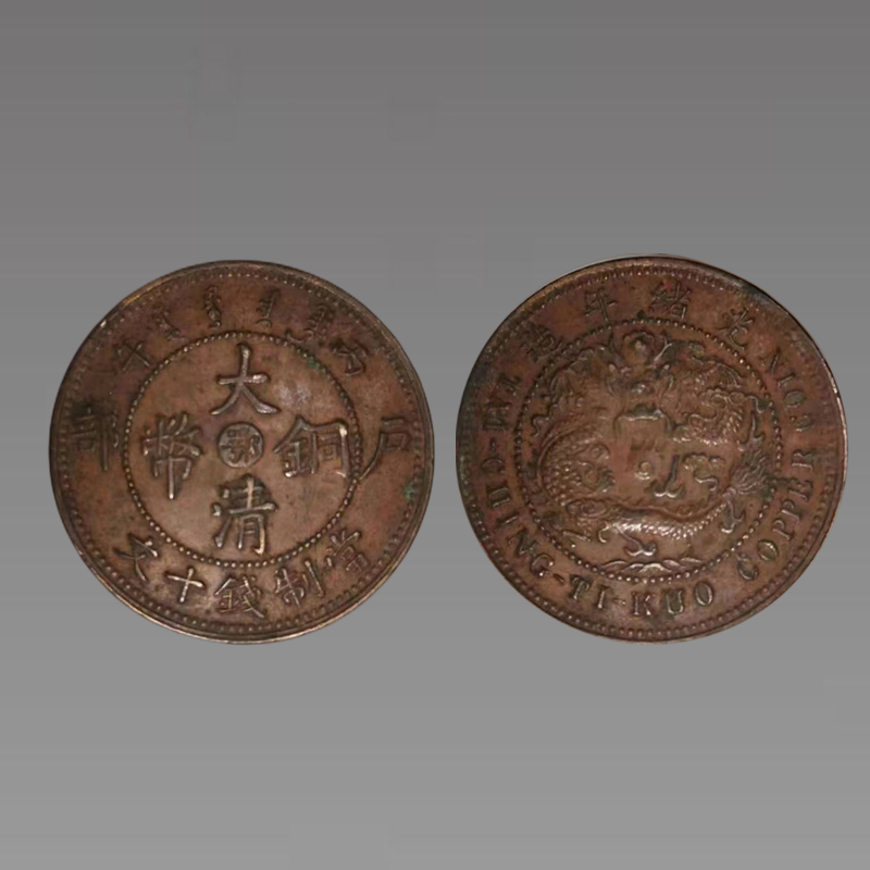 清代机制币的铸造始于1900年(清光绪二十六年),止于1911年(宣统三年),流通时间较短。因其版面设计优雅,雕刻精良,且存世量极为稀少,大清铜币光绪年户部造当十被誉为中国近代制币中的十大名誉品之一。
