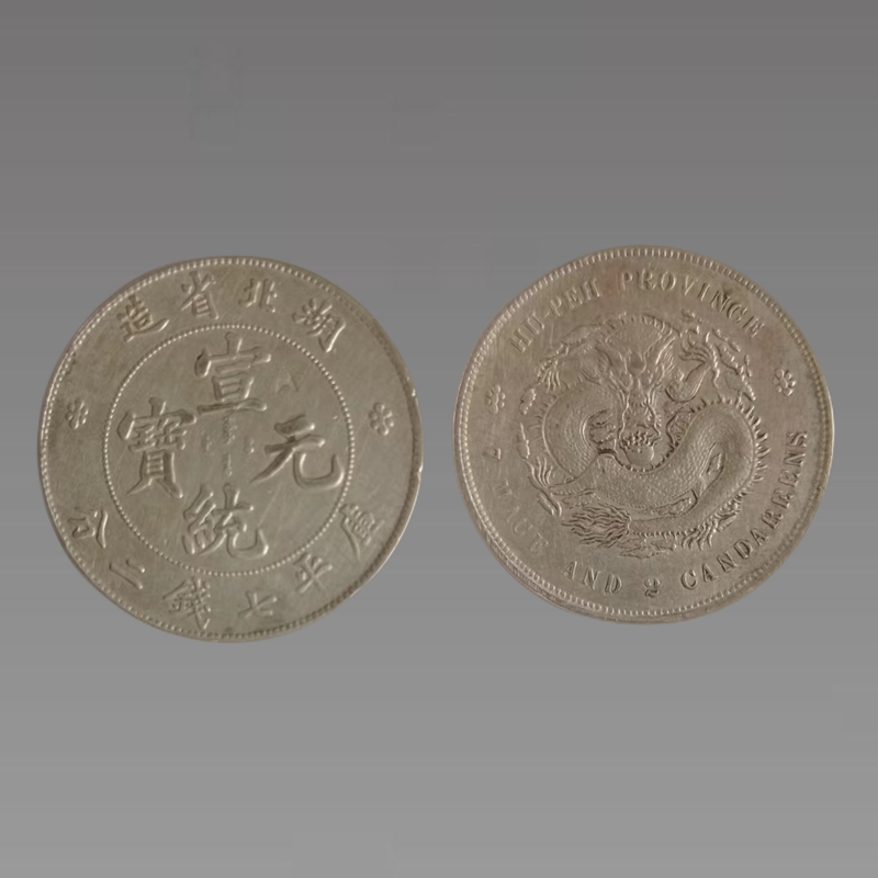 1909年清朝宣统年间湖北省银元局铸行,曾在旧中国广泛流通。银币正面中央珠圈内镌满汉文“宣统元宝”四字,珠圈外上端镌汉文“湖北省造”四字,下端镌汉文“库平七钱二分”六个字,左右两侧各镌一个六花星。银币背面中央镌蟠龙图,上端环镌英文“湖北省”,下端环镌英文币值“库平七钱二分”,左右两端稍上侧各镌一个六花星。