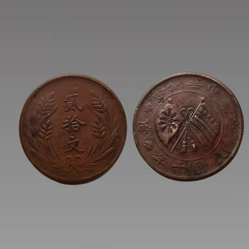 民国成立后,铜元仍继续大量流通使用。1914年,铜元正式改称“铜币”,民国发行的铜币与清最大的区别是龙纹被换成了由稻穗组成的嘉禾纹。各省铸造的铜元大多为两面叉的国旗图案,并有“开国纪念币”或“中华民国铜币”字样。