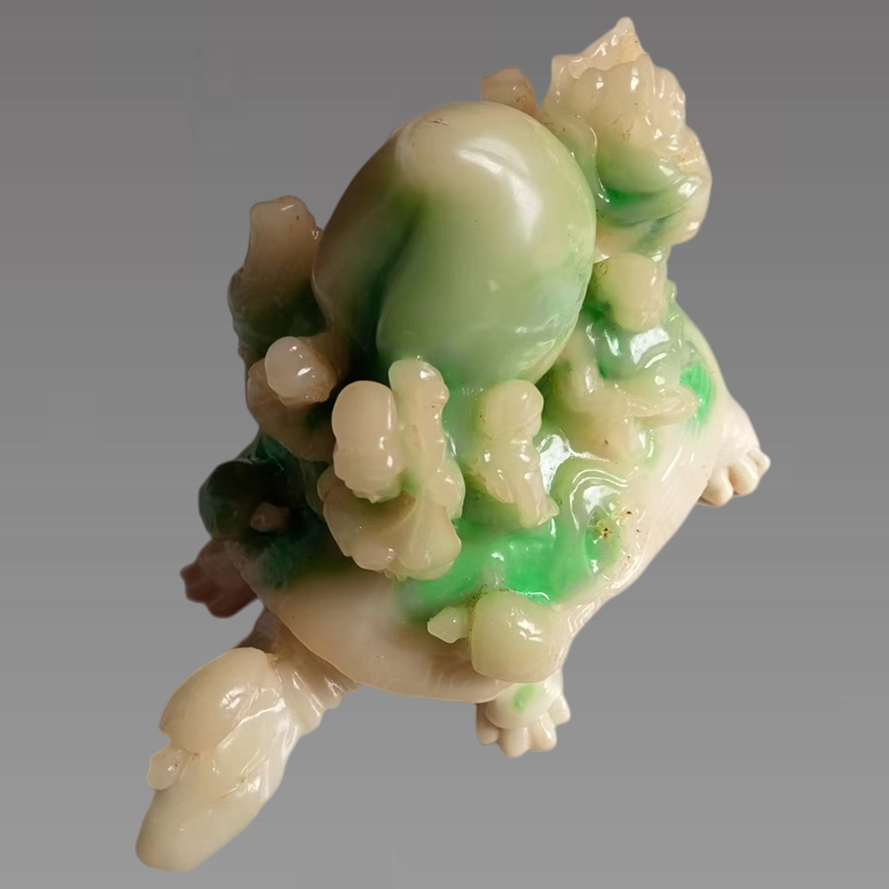 古人向来信奉龟,主财运之道。玉龟身伏四只小龟,头顶和后尾龟盖各一只前后呼应,两只前脚龟盖上各伏小龟一只左右相辅,意寓四方招财进宝,实为大吉。玉龟底部有"大清乾隆年制"落款。龟盖左右两侧各刻花蓝一只,“长”“寿”二字分刻于右左花篮之内。龟盖中间左右两下侧各刻有一枚浮印章,左侧印为“大精华天孝制”,右侧印为“顺风大吉”印。玉龟中间驼有一只大寿桃,周边为八仙立体雕像,观八仙,高谈阔论,神采飞扬,仙意悠悠。何仙姑、蓝采和一前一后,似听似醉,俯仰美好山河。此八仙祝寿玉龟摆件,从瑞兽到人物雕刻,均惟妙惟肖,栩栩如生。