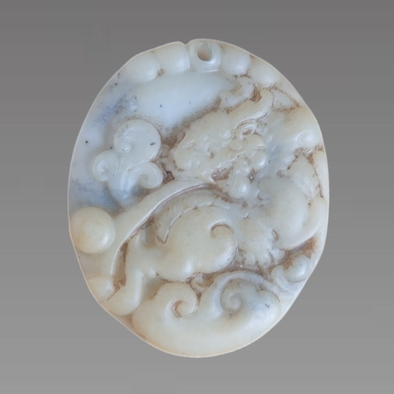 此麒麟玉佩,玉質溫潤,色呈白,包漿厚重,具有一定的沁色!油脂般之特性,色澤光轉。緻密細膩,不見裂隙。白度與本身的質地相符,盡顯天然與雕鑿的美質。牌首其上鏤空洞以做穿線之處。牌面浮雕麒麟含雲紋。麒麟刻畫玲瓏,高額、圓眼、闊鼻尖唇,張口露獠牙,下顎有短鬚,橋形角,龍尾後飄,四肢粗壯有力,頸後生毛祥雲環繞,前足踢踏,龍首回看高處,龍鬚飄揚,盡顯祥瑞氣息,實乃達官貴人佩帶的富貴之物。工藝刻畫到位,線條簡潔流暢。器形呈橢圓,隨形飽滿,薄厚均勻,邊角圓轉,光滑細膩,觸之無稜無角,造型美觀大方,保存完好。刻畫祥瑞吉利的圖像。
