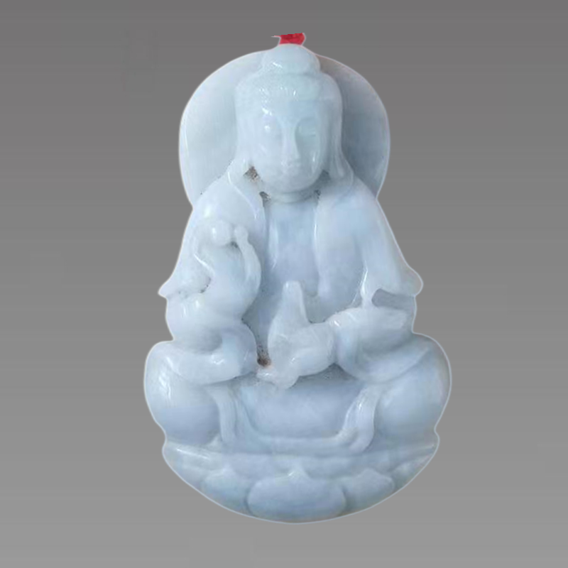 而在翡翠的雕件中,观音也是翡翠雕件的一个永恒题材,观音的真善美,慈悲济世的佛教理念,反映在翡翠雕件作品中,或立,坐,盘卧,或陈设,或供奉,或佩戴,都是以高尚的情操塑造人,在人格的教化中起到了举足轻重的作用。佩戴观音翡翠挂件,祷愿得到观世音的庇佑让佩戴者能平平安安,逢凶化吉。