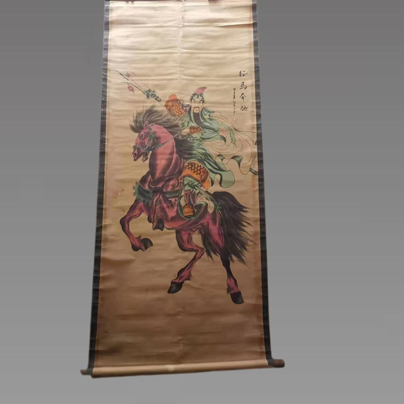 此件:“甲午年初春子平”款征马奔驰关公骑马图,纸张较老旧,彩色墨色浓淡均匀。线条感柔顺,笔下的关公和赤兔战马犹如活过来了一样,栩栩如生!关公的人物表情和提起青龙偃月刀的气势犹如一道闪电直击心灵!恢弘大气!战马全身血色板,战意昂扬!此画,画工精湛,意境磅礴!具有一定的收藏价值和文化艺术欣赏价值!