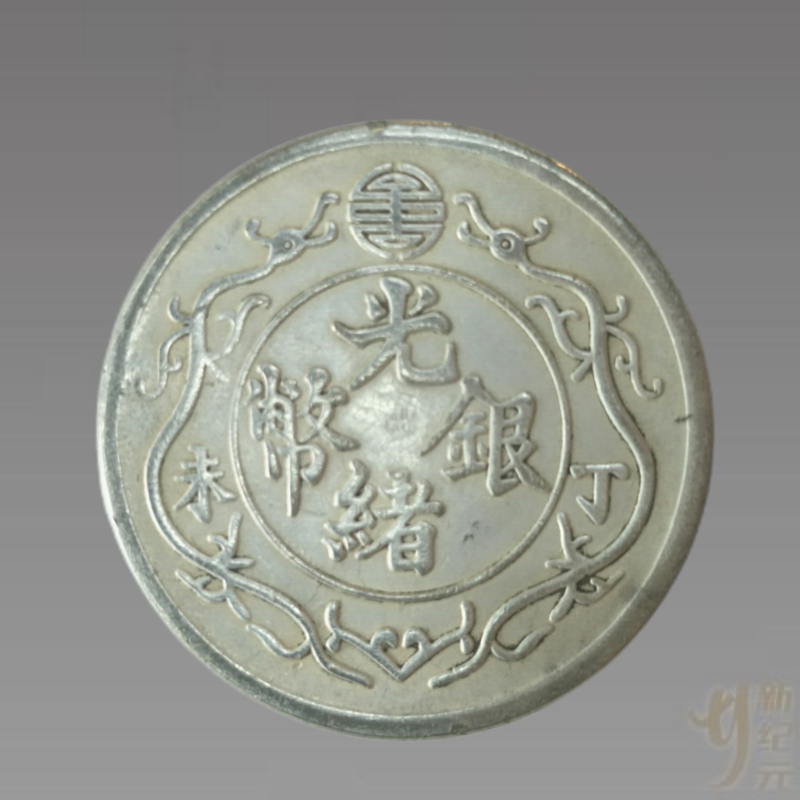 光绪银币丁未一两银币正面中央圆圈内镌“光绪银币”四个字,圈外左右两侧分镌“丁未”二字和一对双龙戏珠(寿字)图案。银币背面中央镌“一两”二字,两侧镌双龙戏珠图案,两条龙的背部和龙腹部分别镌有三团云朵,下端镌海浪图案.此种币在大清机制币中十分稀少,但在币右侧有清晰之环状定图弧圈,币面光滑、平整,原光。
