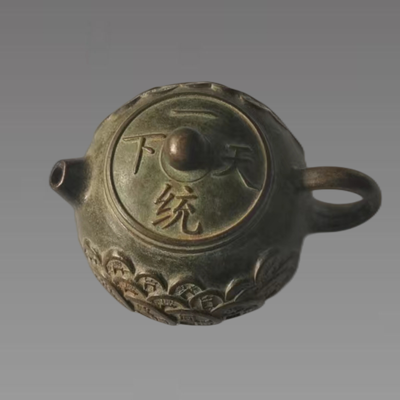 此金钱侧提铜壶的制作也不例外。运用最传统的熔模、镂空、点刻等手工技艺,用锤子、凿子、刻刀、锉刀等工具,纯手工打磨出每一件作品。这种采用手工锻造而成,通过高温烧结、手工制成之后的铜壶,经久耐用,形成自然包浆,当做传家之宝收藏家中更能传世,经过几代人的传承,形成最珍贵的家庭记忆,。壶身线条自然流畅,器型工整高雅,短嘴,壶盖为钮式盖,刻字为“一统天下”,底款为“天子万年”壶身两侧刻画为各年代的方孔钱,取,遍地金钱或者八面来财之意,主要以“长命富贵”、“加官进禄”、 “天下太平”等吉语为深度寓意,这同时也反应了中国传统文化的渗透力。是具有一定的收藏意义和文化艺术欣赏价值!