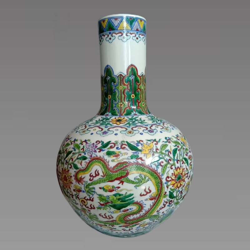 清雍正、乾隆两朝时值盛世,仿古风盛行,仿造的天球瓶更属宫廷大型陈设用瓷。除了传统的青花品种外,五彩、粉彩,斗彩等彩绘天球瓶出现。