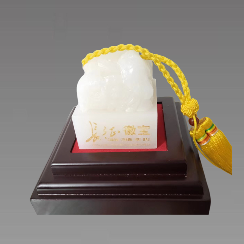《胜利*长征徽宝》玉玺形制为威严的盘龙造型,意为“以诰四方”之用。与弘扬长征精神、长征思想的伟大意义相一致;以清代乾隆二十五宝玺之“敕正万民之宝”为蓝本,沿袭自古以来传承帝王龙玺的传统,精选老矿坑和田白玉料,APEC国礼设计大师冯延明、申文广、冯超等联合创意设计。并力邀“北京奥运徽宝”雕刻大师王希伟担任总雕刻师,运用传统玉玺制作工艺,结合现代玉雕技术精心雕琢而成,整尊宝玺造型大气、玉质温润、刀工精湛,尽显国玺堂皇大气的风范;玺基左侧浮雕遵义会议会址,象征中国共产党和工农红军历史上的伟大转折;玺基右侧浮雕长征路线图,象征长征永载革命史册;玺基背面雕刻伟大领袖毛主席诗词“七律长征”,象征中华民族百折不饶、勇于进取的民族精神。玺文为毛主席曾亲笔题写的“长征”,象征长征精神、生生不息。