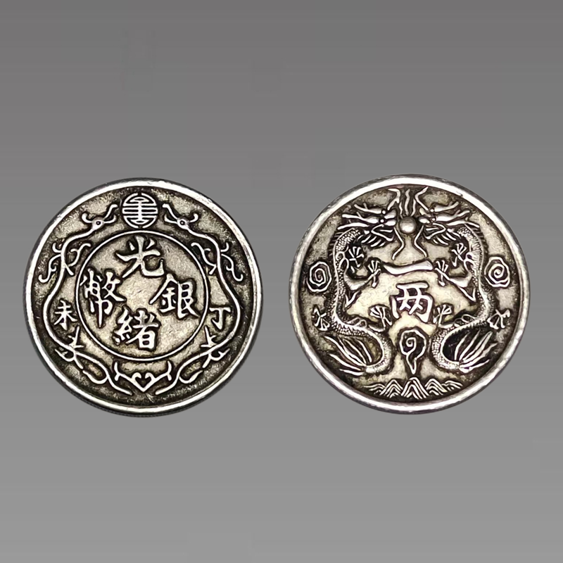 光绪银币丁未双龙一两,正面中央圆圈内镌"光绪银币"四个字,圈外左右两侧分镌"丁未"二字和一对双龙戏珠(寿字)图案。银币背面中央镌"一两"二字,两侧镌双龙戏珠图案,两条龙的背部和龙腹部分别镌有三团云朵,下端镌海浪图案。正面和背面的龙图造型完全不同。此款光绪元宝发行量极少,丁未一两,外形完整、字迹清楚,边线厚薄均匀、间隔密度均匀、锈色及包浆自然。色泽自然,花纹层次适中,外形美观,品质优良,包浆年代感十足,具有一定的收藏价值和文化艺术欣赏价值!