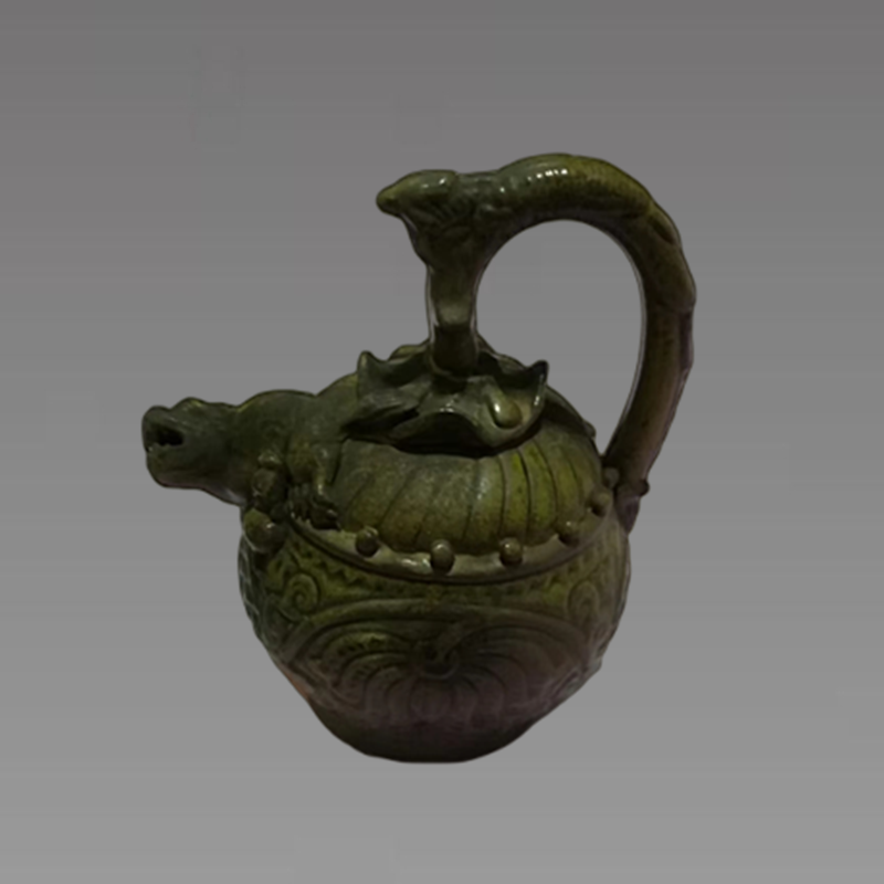 青釉瓜棱牡丹暗刻纹凤首瑞兽提梁壶,整体造型造型稳重大方,浑厚淳朴而又不失秀媚。胎质细腻,釉层透明,釉表光泽强。包浆厚重自然!全身分布均匀。器身通体施均匀青釉,执为凤凰,口为瑞兽,刻画细致入微,栩栩如生,生动自然。其构图布局合理,色泽均匀,线条优美流畅,具有一定的收藏与文化艺术观赏价值。