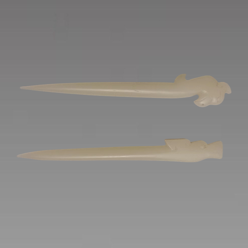 此对龙凤呈祥玉簪,首先从玉质来说,为高级别和田玉,犹如带着油脂光泽的纯白,在烛光之下的光晕是柔和而微微泛白晕的,如同凝脂一般。俗话说“一两羊脂白玉,能抵十两金”。此对龙凤玉簪玉质极佳,其颜色呈脂白色(稍乳黄色),质地细腻滋润,油脂性好,沁色包浆自然,保存完整,无绺裂。龙、凤首圆雕,簪身光滑逐渐变细,龙首嘴巴前倾,龙角后置紧贴龙头。凤首最明显的室眼睛部位为“菱形”凤眼,嘴部凤冠明显!龙凤首之纹饰栩栩如生!雕琢细致入微、形象生动。作为源远流长、蕴含丰富的文化现象,龙和凤都是中华民族的图章、徽记、标志和象征。此对发簪为实用之物,设计精巧,技艺精湛,玉质优良,有较高的观赏与收藏价值。