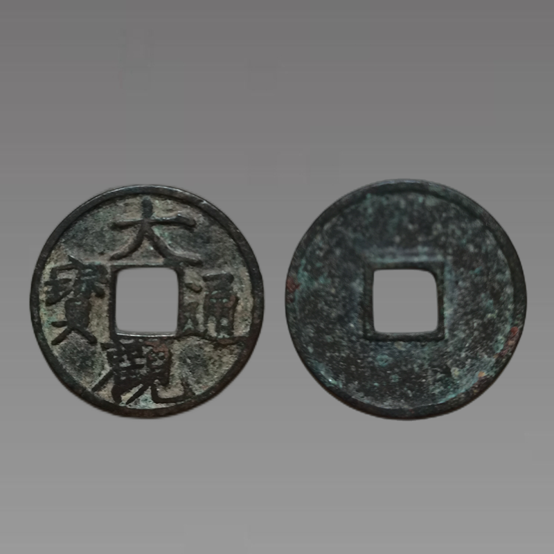 御书钱"大观通宝"钱币穿郭匀称规整,铜色略深。钱文"大观通宝"字体纤秀,气韵贯通,"通"字为宋代方头通(通字"甬"头写作方形)。背面无铭文。大观通宝又有铜钱和铁钱之分。北宋由于战争频繁,官家滥铸及民间盗铸蜂起,铜货短缺。因此政府开铸铁钱。