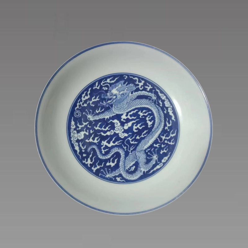 此盘撇口、弧腹、圈足,内外满施白釉,足圈无釉,白釉底,底部双圈内青花书“大清雍正年制”六字楷书款,为清代御窑的经典品种。形制周正,器壁盈薄。内沿口饰青花弦纹两道,盘心於双圈内绘立云龙纹,外壁绘双龙戏珠纹,龙形矫健,张口怒目,须髮、鳞片绘製精细。青花发色纯正明艳,釉面光润匀洁,纹饰典雅流畅。是件具有一定收藏价值和文化艺术欣赏价值的藏品!