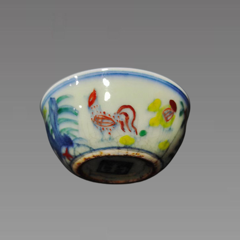 此杯是明成化朝景德镇御窑厂烧制的宫廷用器,明清文献多有所载,颇为名贵。由于鸡缸杯的名贵,引来仿制不息。清康熙、雍正、乾隆、嘉庆、道光各代无不仿烧。康熙时仿品最佳,从造型到纹样都贴近原作,鉴别时须从造型、胎釉、色彩及款识上仔细品察。