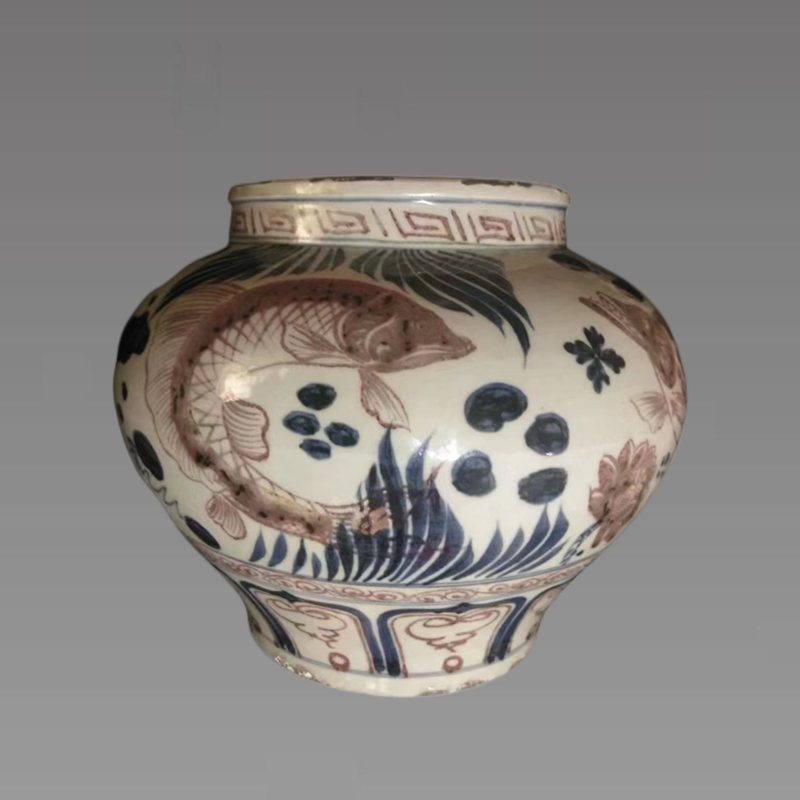 青花釉里红鱼藻纹大罐,器型端庄,大气,釉面莹润。颈部以青花釉里红饰回纹为主题纹,相互交映一周,主题纹饰突出,釉里红纹线条清晰,风格彰显出元代风格大气的工艺手法。腹部以鱼藻纹为主题,釉里红鲤鱼形状逼真,犹如鲤鱼跃龙门般的身姿,造型活灵活现。青花饰荷花纹、荷叶及水藻纹饰。每个主题纹饰均有不同。近足处绘变体莲瓣纹。底足露胎。青花釉里红绘鱼藻纹,游鱼嬉戏,水藻摇曳,以鱼水之乐为纹饰,表达“年年富贵”的美好夙愿。因鱼居水中,不便微察细观,因此画鱼又较其他禽鸟写生更艰。凭空想象却能捕捉个中神髓,画得游鱼自得,难能可贵。整体绘画笔触细腻,恣肆而不失神韵,青花的海藻和釉里红的鱼纹完美结合,相映成趣。青花釉里红鱼藻纹大罐,青花、釉里红互为衬托,红、蓝交相辉映。整体形成一种气度雍容而又花团锦簇的艺术效果。釉质光润透亮,釉面光润闪青,青花色调浓艳苍翠略有晕染,料浓起处起黑斑。装饰纹样主次分明,线条绘画酣畅有力,为青花釉里红瓷器中的精品,具有一定的收藏价值和文化艺术欣赏价值!