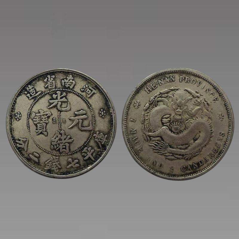 银币光绪元宝1898年--1907发行,正常成色为89%-90%。正面铸有铭文,顶部铸楷体"XX省造"或"造币总厂",底部铸货币价值如:"库平七钱二分",中心直读"光绪元宝"四字,币中心为满文"光绪元宝"。