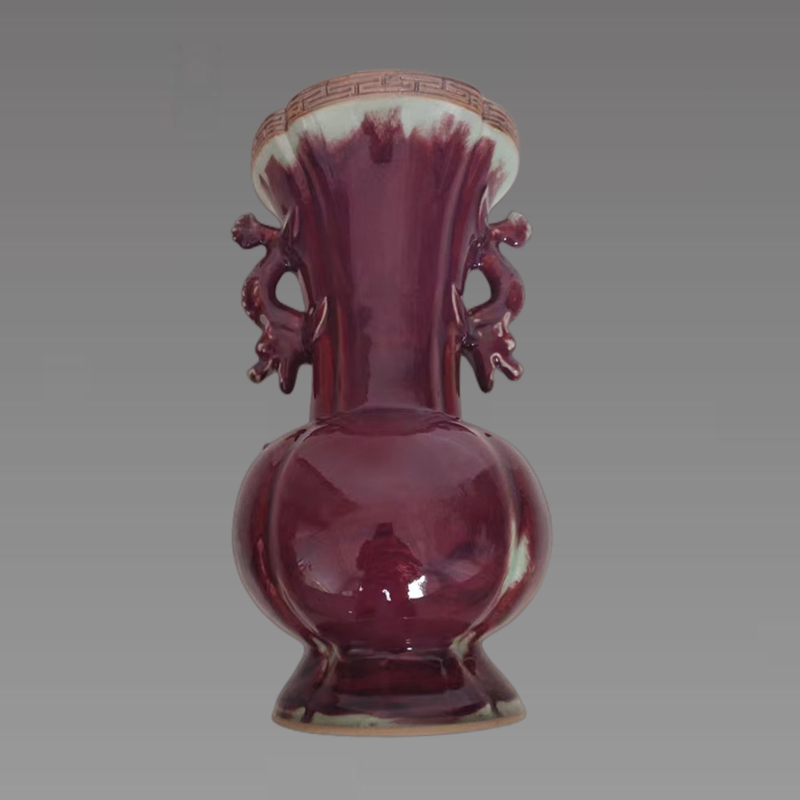 此“双龙瓶”器形端庄稳重。双龙造型矫健挺拔、酒脱优雅,灵动传神;双龙立于瓶肩左右俯视瓶足,瓶体线条流畅,古朴典雅;整体师古不泥、恢弘大气。作品寓意尊贵吉样、富贵安康。作品以最简洁的线条表达丰富的福祉,契合钧瓷简洁凝练,优雅自然的审美风格。是近年来亨盛钧瓷关于造型写意的扛鼎之作。具有一定的文化艺术欣赏价值!