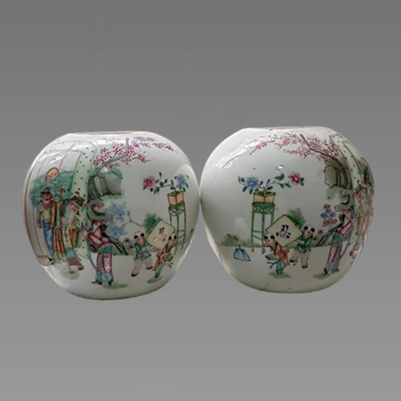 瓶身绘有两个孩童在花卉下嬉戏玩耍的纹样,孩童形象描绘逼真,活灵活现,栩栩如生。罐身上绘有人物故事场景,纹饰内容极其丰富,且相承接,过渡自然,一派和谐。场景上的纹饰无论是人物的五官描绘、动作、神情,还是自然景物的刻画都十分生动自然,惟妙惟肖,栩栩如生,观之,仿佛该场景就在眼前一般,可见匠师技艺十分高超,是匠师独具匠心之佳品。