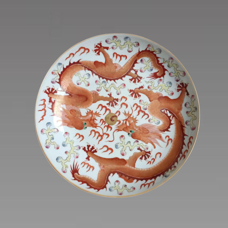 “大清道光年制”梵红描金双龙戏珠盘,敞口,浅弧腹,圈足。盘内以梵红彩双龙戏珠纹饰装饰。盘外以绿彩海水纹一圈,内盘整绘双条金龙,周围衬以火焰纹和云纹,整体白釉打底,圈足内施白釉,釉面温润似玉,外底署梵红篆体书“大清道光年制”双行六字款,造型秀雅挺拔,曲线舒展美妙,线条流畅自然,釉料汁水莹厚如堆脂,龙纹颜色艳丽而有宝光,如雨后霞霁。宝光内蕴,尽显静穆素雅。底露白胎,圈足圆润,胎骨坚致细白,制作精致,质量高超,收藏陈设佳器。具有一定的收藏价值和文化艺术欣赏价值!