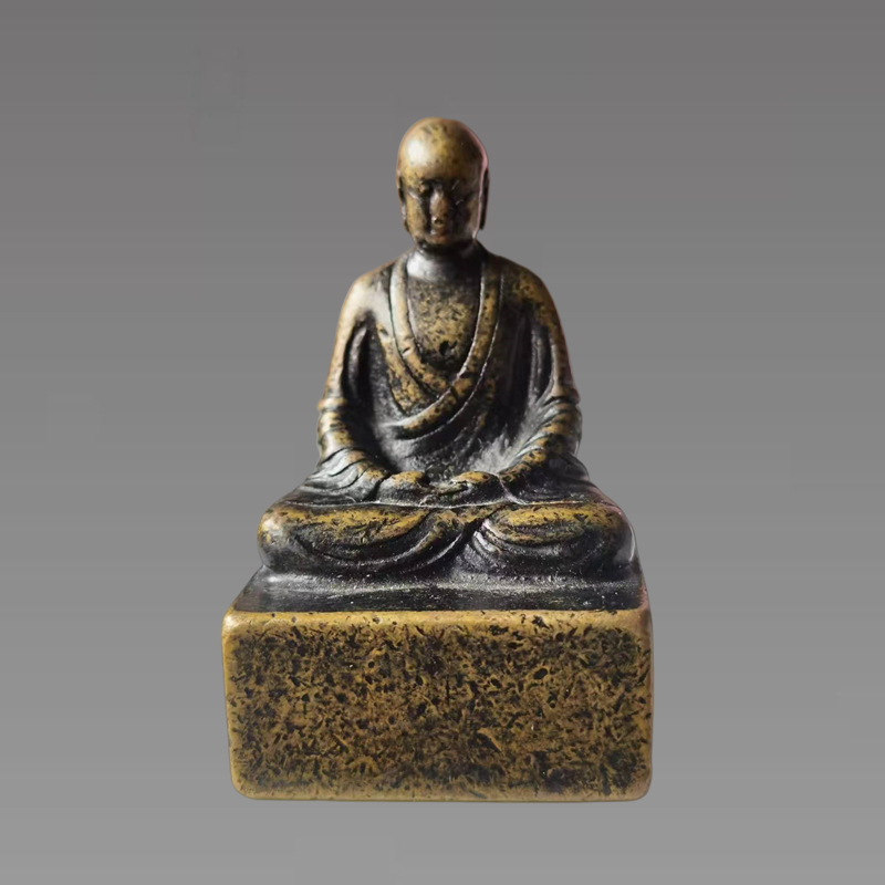 此“同治”款佛像四方斋馆铜印章 为赵之谦为沈树镛所刻灵寿花馆清代流派印,铜质地,方型台面,圆弧状钮柄,印文书“灵寿华馆收藏金石印”篆体九字,此朱文印用字既非小篆,也不似缪篆,而有镜铭钱币文字之趣。“花”字六条斜线便出乎意料。“灵”字下方各有一斜线,与之呼应,便使“花”字的斜线并不突兀。印中横线基本平行,但其排叠的疏密却不雷同,大都上紧下松。而竖线甚至都不垂直,总有些倾斜敧侧。文字秀美隽永,布局规整,整个印章铸造精良,而印体厚重,提升了整体的美感,印钮为玄奘佛像,整体造像虽小却端庄大气,金刚坐像塑型典雅高贵,刻划细腻,近距离观赏令人赞叹。依其造型风格与工艺的水平判断,黄铜质,整体刻画自然,线条感十足,经历逾百年,表面自然磨损痕迹覆有温润之包浆皮壳,印文结构饱满,文字纤细、深峻,其少见的精美制作工艺,是一枚不可多得的艺术精品,具有一定的收藏价值和文化艺术欣赏价值!