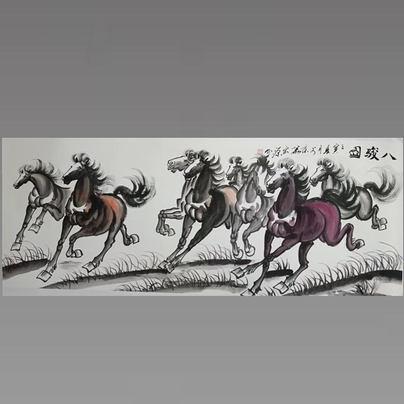 古代,马往往和人同生共死、荣辱与共,它的精神一直被世人所崇尚。马象征着昌盛、发达、勇敢、征服、忠诚、飞黄腾达、学业有成等。胡宏源是徐悲鸿先生的再传弟子,掌握了徐老先生的画马精髓。为了将马画得传神,平时,他经常在马厩里一呆就是一天,废寝忘食!其运笔自如,作品笔触雄浑、线条流畅,转瞬间,驰骋草原的骏马便已跃然纸上,栩栩如生地展现了骏马刚劲、威武、神速的气质特点。这幅作品描绘了八匹形态各异的骏马。他在完美传承师祖徐悲鸿画技的基础上,将西画中的造型与国画中的写意相融合,下笔刚健有力,八匹骏马好似向着观者飞奔而来!亦此作品具有一定的收藏价值和文化艺术欣赏价值。