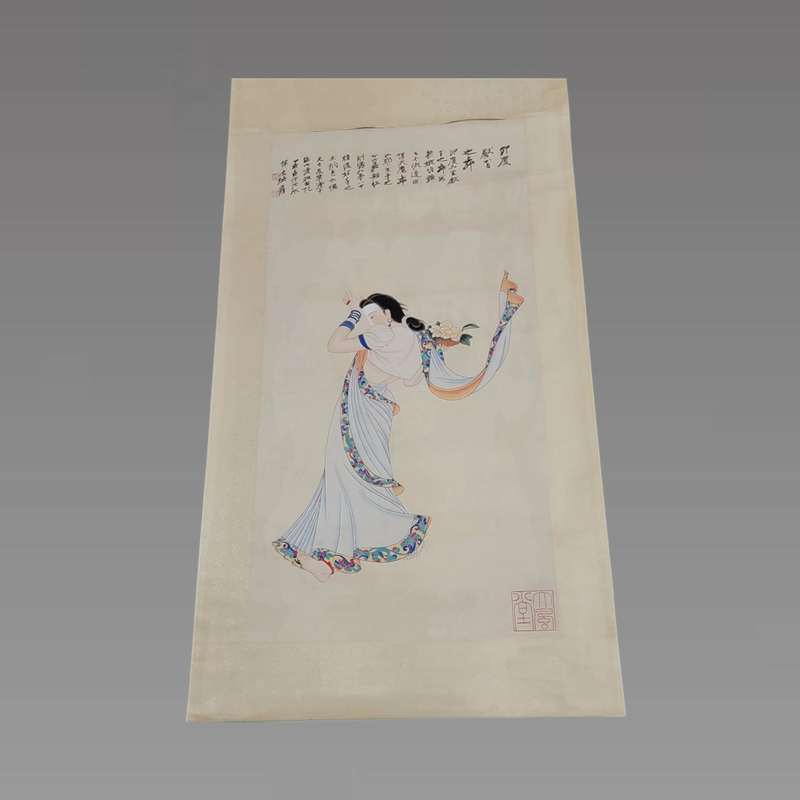 张大千笔下的舞女,有古代仕女画的遗意,但内在的精神,有时代的气息,更具有张大千心中仕女美的姿态风韵,颇有个性。张大千认为:“舞女面部设色不可太浓,仕女必须脱俗恬淡,有飘飘然之感。”形态美,气质美,微妙的动感美,是他理想中的舞女形象。此幅舞女图极具异域风情,又具中国古典美女之韵,为大千早年之作,属于典型的陈老莲一派画法,这在张大千的人物画里是难得一见的。整幅笔法精工细致,设色淡雅清澈,具有一定的收藏价值和文化艺术欣赏价值!