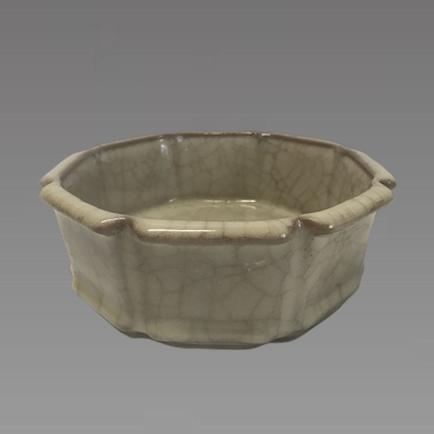 此哥釉八棱笔洗,八棱凸显,撇口,直率而不放肆,整体具有一种纯朴、典雅的艺术效果。笔洗是典型的传世哥釉产品,造型端庄秀美,“金丝铁线”片纹和器身凸起的八棱使单一色釉增添了起伏变化,更具韵律感。此器圆中寓方,方中寓圆,造型独特,做工考究,与宋代理学风格中正平和,天人合一的理学审美极其契合。施粉青釉,釉层肥厚,温润如玉,用手撫摸似婴儿肌肤,手感极佳,不同光线下观察,釉色变化,稣光宝暈,给人以独特的美感。胎为紫褐胎,修胎规整细腻,传说与哥釉以玉石玛脑入釉有关。更增加了本藏品的收藏内函。具有一定的收藏价值和文化艺术欣赏价值!