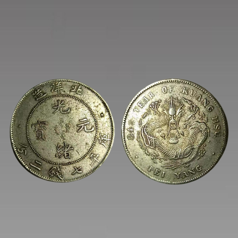 银币背面中央镌蟠龙图,上环镌英文“光绪34年”下镌英纹“北洋”,左右两端稍下侧各镌两个圆点。光绪元宝是清朝光绪年间流通的货币之首。共有十九个省局铸造,除中央户部,地⽅省所铸铜元。是首批引进海外技术的印发流通货币,对于现今也蕴藏了一定历史意义。