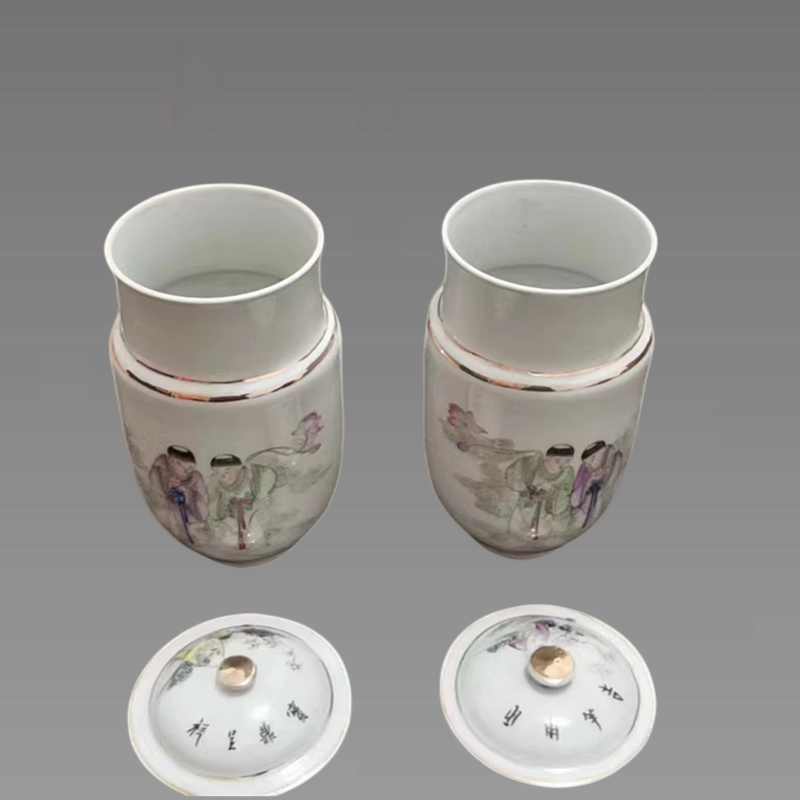 此罐圆筒式口,圆肩,肩以下为圆筒式,渐收至圈足,盖平顶以描金圆钮为盖钮,口肩相连处以描金双圈,通体施白釉,其一面绘有人物和植物纹饰,另一面写有诗词,其笔画行云流水,墨元润涩,笔感非常有味,笔性非常自然,字中藏画意,意蕴丰富,情趣盎然。绘画线条流畅,刻画细腻,栩栩如生。整器形制规整,胎釉细致缜密,工艺精湛,色调柔,实乃珍品。具有一定的收藏价值和文化艺术欣赏价值!