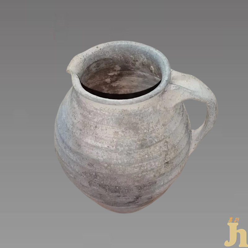 灰陶分泥制灰陶和夹砂灰陶两种,该器即为陶土经过淘洗的泥质灰陶,撇口,束颈,溜肩,鼓腹,圜底,口带嘴,侧面带手柄,肩腹部拍印有旋印纹,旋印纹陶较一般陶器细腻而坚硬。此器属当时的一种盛水器,容量较大,器型端庄,给人以饱满、柔和的感觉,规整厚实,整体古朴大气,俊秀漂亮,无裂无修,原汁原味的古陶精品,具有一定的收藏价值和文化艺术欣赏价值!