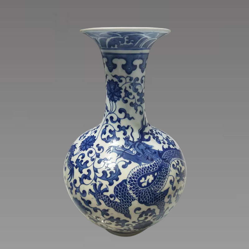 此青花缠枝花卉龙纹撇口赏瓶,口部外撇,丰肩,圆鼓腹,圈足外撇。颈部饰海水纹,往下分别缠枝花卉纹,五爪龙纹等,层次分明。全器以缠枝花卉纹和龙纹为主题,辅以仰莲瓣纹及卷草纹等纹饰,布局疏密得当,富丽堂皇。青花发色鲜艳,绘画流畅精细,为乾隆朝宫廷陈设佳器,传世甚少。腹部画一条五爪龙游戏于云朵间,龙作腾飞状,睁眉瞠目,炬眼炯炯,张牙舞爪,刚劲有力,青花发色浓艳青翠, 器底有“大清乾隆年制”三行六字青花篆书款。字迹纤细秀丽,胎体细腻洁白,器身光滑整齐,没有接胎的痕迹。造型规整,比例和谐,俊秀稳重,端庄大方。青花色泽浓淡有致,胎质细腻,白釉莹润青花发色稳定,画工点染细腻流畅,为青花赏瓶的标准器型。具有一定的收藏价值和文化艺术欣赏价值!