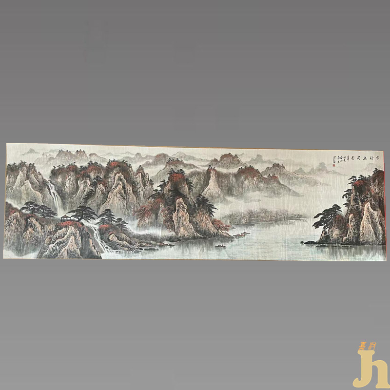 此山水画有一种自然造化之美,不管是山水还是点缀其间的人物和景色,都彰显出一种之气,飘逸灵动。其山水画意境深远,观看其画作仿佛回到了阔别已久的家乡,让人心生向往。其作品既有南派山水的风韵,又兼有北派山水的气派。画的意境富有灵性,墨色淡雅而富有动感,看似波澜不惊的画面,则暗藏勃勃生机。他的山水画既可雄浑荒凉也可清幽雅致,雄浑处山势连绵崇山峻岭,清幽处水平如镜,山体朦胧,烟波浩渺。无论是哪种构图,都体现出流畅的气韵和唯美的意境,观之总是意犹未尽 。