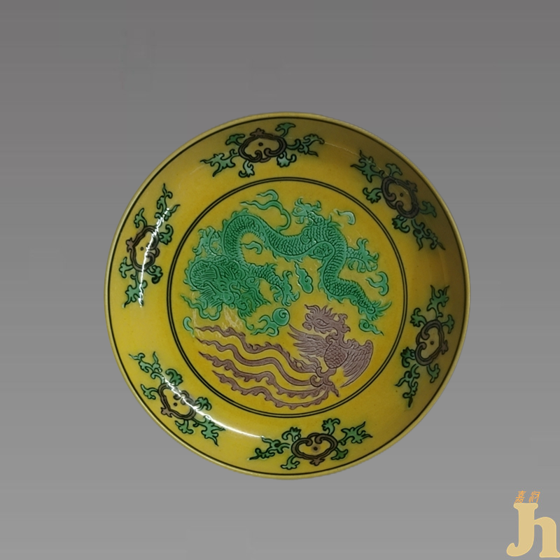 根据目前的考古资料显示,黄地绿彩工艺最早出现于明永宣时期,其工艺较为复杂,当先于素胎之上锥刻纹饰以高温烧成涩胎,复施黄釉绿彩,再低温烘烧而成。在黄釉上绘绿色五爪云龙和凤凰飞舞,清代始烧于康熙朝。据《国朝宫史》记载,康熙一朝最早规定清宫用瓷等级:皇帝、皇太后、皇后使用里外黄釉的瓷器;皇贵妃用外黄里白的瓷器;贵妃、妃使用黄地绿龙瓷器;其余偏妃贵人皆用黄地紫龙的瓷器。因为需求量较少,所以生产数量便不及其它种类,清代康熙朝之遗存可谓少之又少。