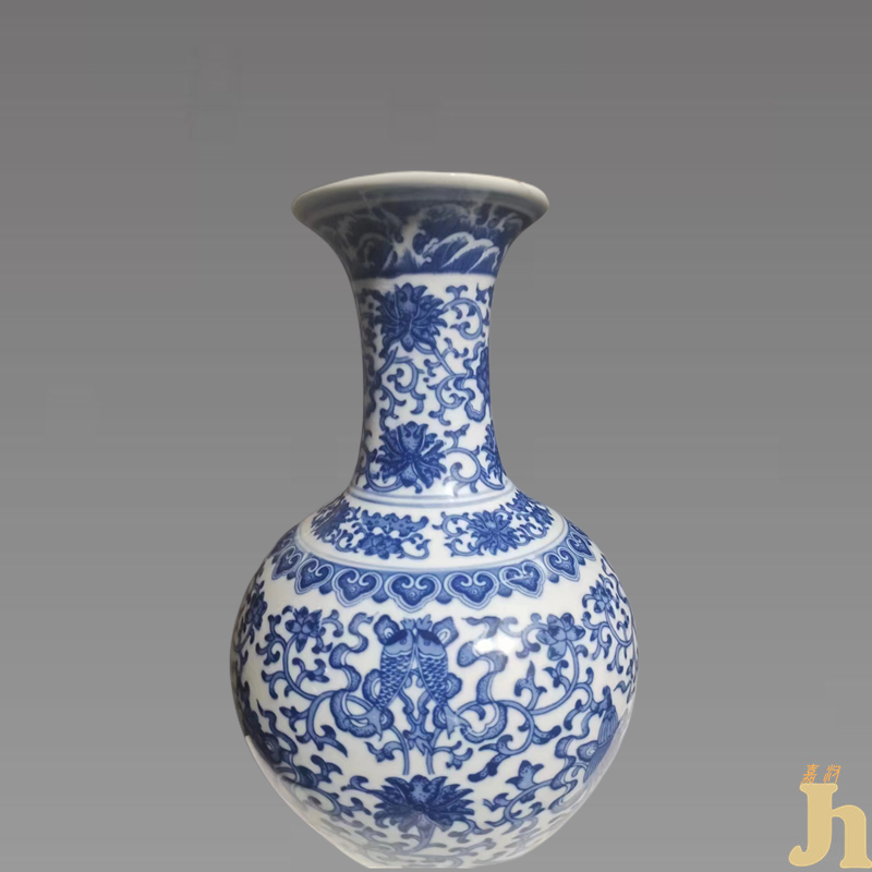 此青花缠枝花卉纹赏瓶,口部外撇,丰肩,圆鼓腹,圈足外撇。颈部饰缠枝,口、肩、腹底端、足根部等分别绘、如意云、缠枝花卉、变体莲和卷草纹边饰,层次分明。青花色泽浓淡有致,胎质细腻,白釉莹润青花发色稳定,画工点染细腻流畅,为青花赏瓶的标准器型。瓶底书青花“大清乾隆年制”六字篆书款,字迹纤细秀丽。具有一定的收藏价值和文化艺术欣赏价值!