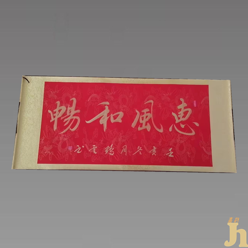 董鹤云老师熔古铸今,渐次形成自家风格。他的书法力求闲逸抒情,如奔如跃,字体大小参差,揖让有致,笔势于恣肆中蕴涵恭谨,章法于散 乱中隐藏妙趣。结构老到,用笔率真,不经意间而霸气存焉。他的草书致力于洒脱奔放,阵马风檣,气象夺人。此“惠风和畅”金墨提笔,尽显奢华与高档!构图新巧,墨气淋滩,雄强老辣,势不 可当,颇具冲击力和感染力。线条流落而沉着,颇具功力,含金墨色枯湿相间,恣纵由心,能看出作者独具的匠心与才气。此作品具有一定的收藏价值和文化艺术欣赏价值!