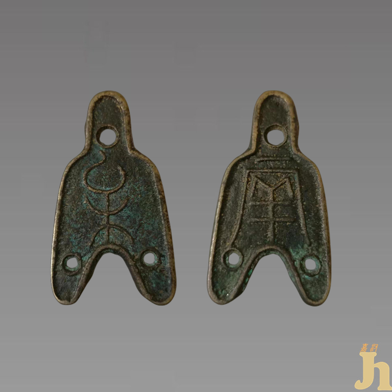 圆首、圆肩、圆足、圆裆,同圆是布,唯有首及两足,各有圆形穿孔一,因名三孔布。有大小两种,为两等制。大晶背"两"字,小品背"十二朱"。三孔布发现较晚,传世品极稀,且在新