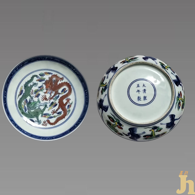 “大清雍正年制”青花粉彩双龙戏珠盘,敞口,浅弧腹,圈足。盘内以五彩双龙戏珠纹饰装饰。盘外以青花仙鹤粉彩祥瑞纹一圈,内盘整各绘一条青龙和红龙,周围衬以火焰纹和云纹,整体白釉打底,圈足内施白釉,釉面温润似玉,外底署青花篆体书“大清雍正年制”双行六字款,造型秀雅挺拔,曲线舒展美妙,线条流畅自然,釉料汁水莹厚如堆脂,龙纹颜色艳丽而有宝光,如雨后霞霁。宝光内蕴,尽显静穆素雅。底露白胎,圈足圆润,胎骨坚致细白,制作精致,质量高超,收藏陈设佳器。和收藏投资首选,具有一定的收藏价值和文化艺术欣赏价值!