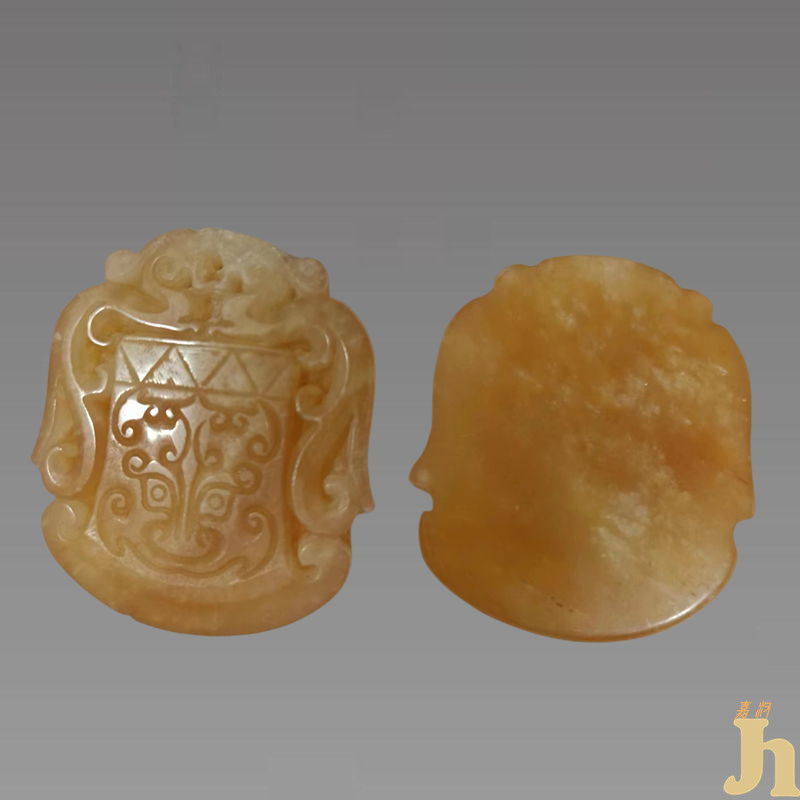 此人面双龙纹玉佩,玉質溫潤,色呈黄色,包漿厚重,具有一定的沁色!油脂般之特性,色澤光轉。緻密細膩,不見裂隙。色度與本身的質地相符,盡顯天然與雕鑿的美質。雕刻抽象人面,能见其眼睛,鼻子,上左右两面各一条龙纹,纹饰雕刻栩栩如生,乃達官貴人佩帶的富貴之物。工藝刻畫到位,線條簡潔流暢。器形呈橢圓,隨形飽滿,薄厚均勻,邊角圓轉,光滑細膩,觸之無稜無角,造型美觀大方,保存完好。玉佩的玉质油润,结构细腻,整体呈现熟感,玉质似乎属于和田玉黄白籽料。图看器表可见熟旧包浆,包浆厚重,皮壳典型。整体器表可见自然老的砂感,砣工处老砣砂痕典型,浮雕处拉丝工痕为比较典型的老拉丝痕特征,工艺考究,具有一定的收藏价值和文化艺术欣赏价值!