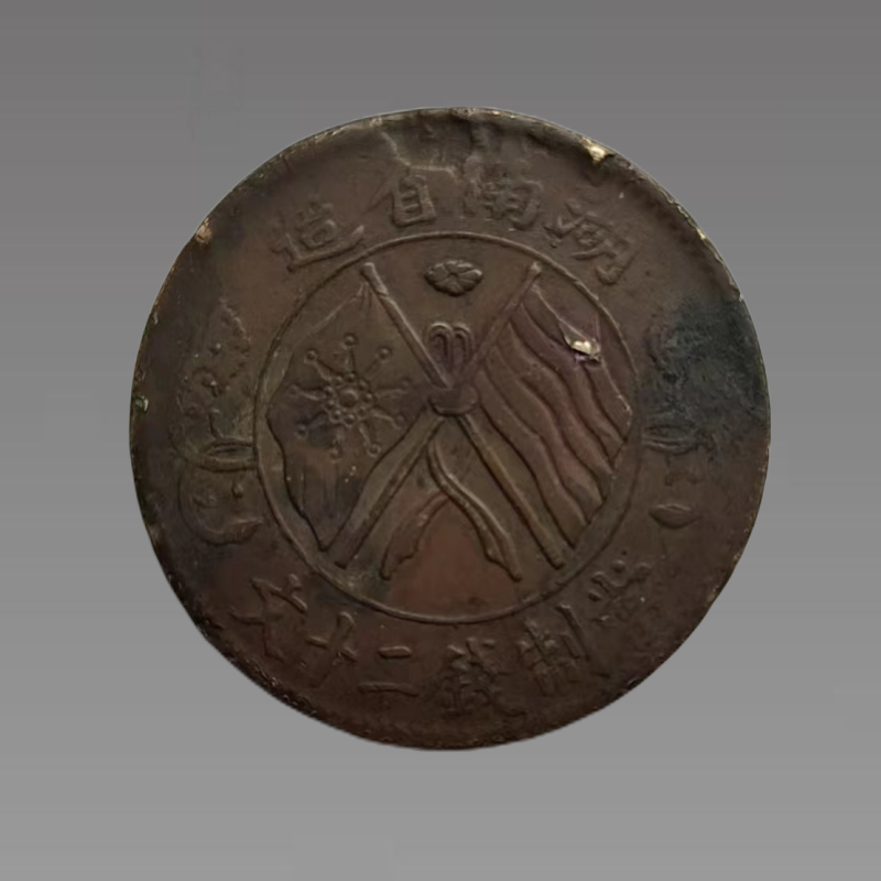 1912年元月,中华民国政府成立,国父孙中山就任中华民国临时大总统,并颁布“临时大总统令”,取样清代铜币模本,鼓励铸造纪念币——中华民国开国纪念币。湖南省造双旗币当制钱二十文,就是产生于这一历史时期。